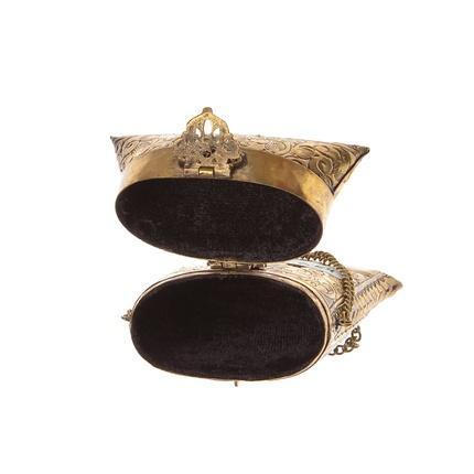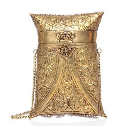 Clutch de latón dorado, labrado y con cadena. Interior en terciopelo negro. Medidas aprox 16x11x4 cm. Cabe el teléfono, las llaves y un pintalabios. El precio de alquiler comprende 5 días (de miércoles a domingo) y deberás especificar las fechas de tu interés en la cajita de comentarios antes de finalizar tu pedido, o escribiéndonos a info@strending.com. Entrega y recogida a domicilio, elige envío EXPRESS.